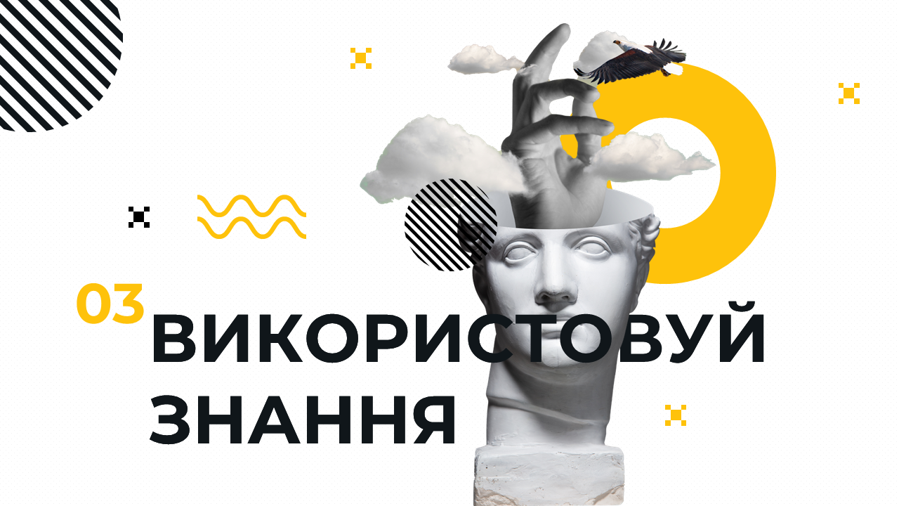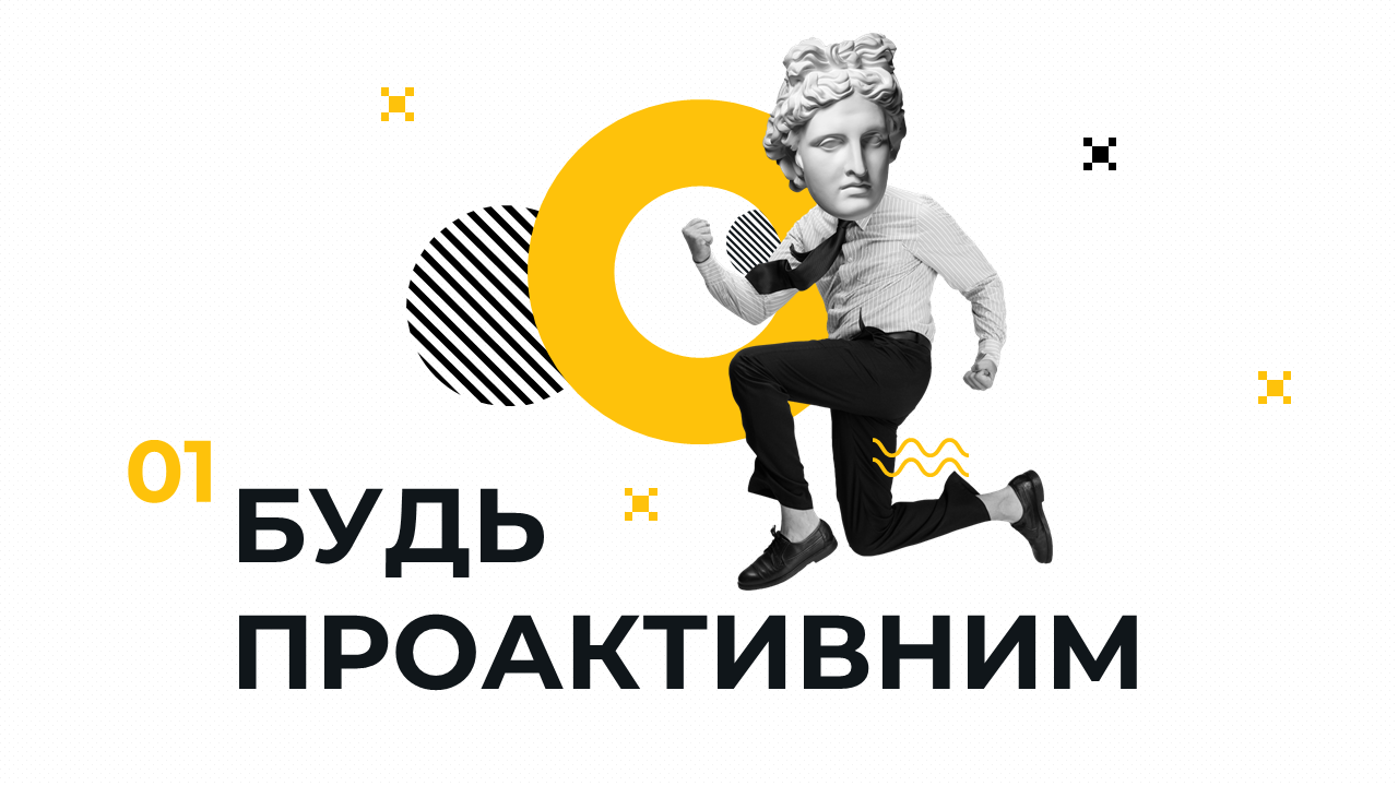 We designed a bold, dynamic presentation on horizontal career development for a young audience, using minimal text, vibrant morph animations, and striking visuals - from a bright yellow palette to black-and-white graphics and classical sculptures arranged in eye-catching collages.